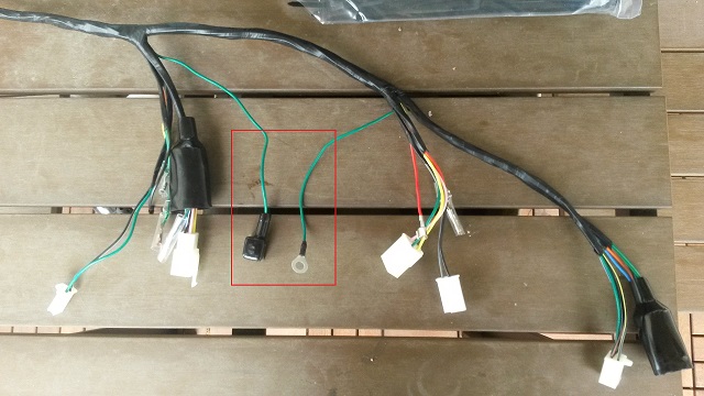 Mihin kuvan kaksi vihreää johtoa tulee? Vasen taitaa mennä akkuun, mutta entä oikea? Runkoon? Voihan kaapeleiden paikat vaihtaa niin, että oikea menisikin akkuun?
